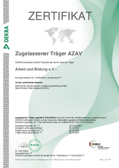 Arbeit und Bildung e.V. ist ein Anbieter von zielgruppenorientierten Beratungs- und betrieblichen Integrationsdienstleistungen und legt bei der Umsetzung seiner Aufträge auf einen individuellen kundenorientierten Zuschnitt in der Beratung, Betreuung und Integration einen besonderen Wert.